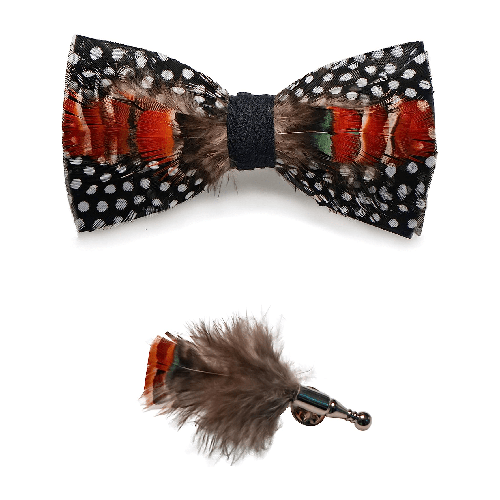 Orange & Black White Polka Feather Bow Tie with Lapel Pin